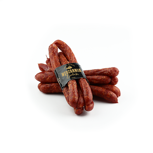 Geräucherte, rohe, dünne Würstchen mit charakteristischem Geschmack. Ein speziell ausgewähltes Gewürzset mit einer zarten Pfeffer- und Paprikanote. Sie schmecken warm oder frittiert, aber viele Rohkostliebhaber werden auch kalt als kleiner Snack ihre Freude daran haben.